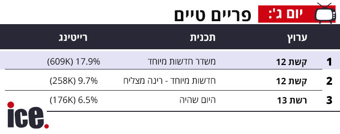 ביתר רצועות היום, שליטה מוחלטת של קשת 12 בכל השביעייה הראשונה. תכנית חיסכון ראשונה עם 18.8%, שש עם עודד בן עמי עם 17.3%, חמש עם רפי רשף עם 16.3%, מהדורה ראשונה עם 13.6, שלוש עם עופר חדד עם 12.2%, משדר מיוחד עם עופר חדד עם 11.9% ומשדר מיוחד עם עמליה דואק נעל את השביעייה הראשונה עם 10.7% רייטינג.