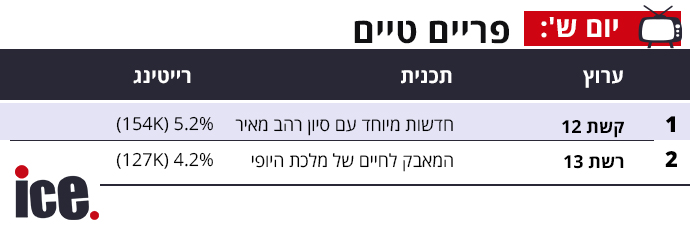 אתמול, התאפיינה רצועת הפריים טיים בנתונים חלשים, ככל הנראה בגלל שידור האירוויזיון. בקשת 12 שודרה מהדורת חדשות מיוחד בהגשת סיון רהב מאיר והערוץ זוכה ל-5.2% ברייטינג ו-154 אלף צופים. הפרש של 1% יותר מנתוני רשת 13 ברצועת הפריים טיים, שם שודר הסרט "המאבק לחיים של מלכת היופי" וזיכה את הערוץ לרייטינג של 4.2% שמהווים 127 אלף צופים בערוץ.