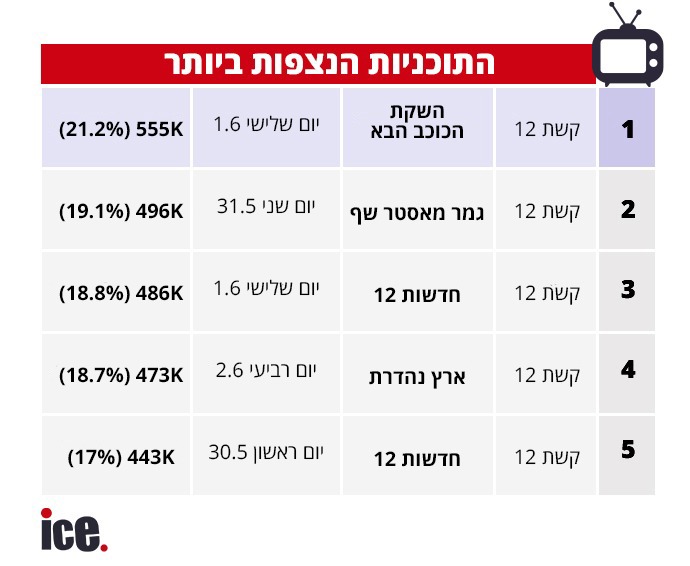 רייטינג שבועי: מאסטר שף הסתיימה, הכוכב הבא נפתחה וקשת 12 הרוויחה