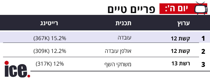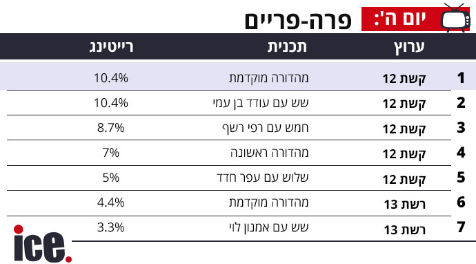 ברצועת הפרה-פריים גברו אתמול התוכניות של קשת 12 בכל השעות, כאשר מהדורת שלוש בצהריים של הזכיינית זוכה לרייטינג גבוה יותר מהמהדורה המוקדמת של המתחרה. סדר הדירוג של התוכניות, באופן לא מפתיע, תואם את שעת שידורן כאשר אלו הקרובות יותר לפריים-טיים מציגות רייטינג גבוה יותר מאלו שלפניהן: מהדורה מוקדמת ושש עם שתיהן עם 10.4%, חמש עם רפי רשף עם 8.7%, מהדורה ראשונה עם 7% וחדשות שלוש עם 5%. בינתיים, ברשת 13 זכתה המהדורה המוקדמת ל-4.4%, ושש עם אמנון לוי ל-3.3%.