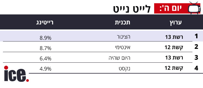 רצועת הלייט-נייט חווה גם היא את הירידה של אחרי המהדורות המאוחרות של תקופת המבצע הצבאי, כאשר הצינור של רשת 13 עדיין מנצחת ברצועה בימים רגילים עם 8.9%, אינטימי של קשת 12 מזנבת בה עם 8.7%, ואחריהן רשת שוב מובילה עם 6.4% להיום שהיה לעומת 4.4% לנקסט של קשת 12.