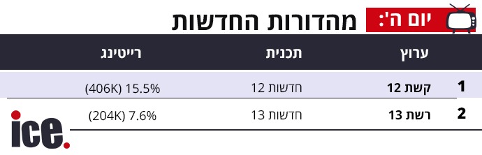 במהדורות חדשות ניצחון נוסף לקשת 12 עם 15.5% רייטינג ו-406 אלף צופים לעומת חדשות 13 עם רייטינג 7.6% ו-204 אלף צופים.