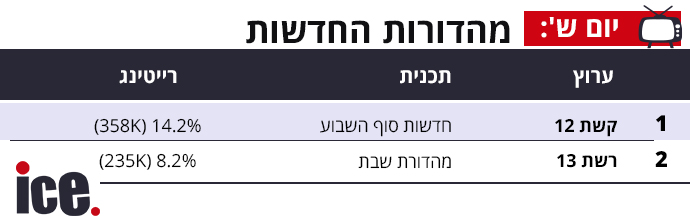 ברצועת החדשות קשת 12 מנצחת עם נתוני צפייה של 14.2% ו-358 אלף צופים למהדורת סוף השבוע בהגשת דנה ויס. בערוץ המתחרה, רשת 13, מהדורת השבת עם הילה קורח מגיעה ל-8% צפייה בלבד ו-235 אלף צופים. עם זאת, המעבר בין רצועת החדשות לרצועת הפריים טיים מתבטא בעלייה בשני הערוצים, כשברשת 13 העלייה גבוהה יותר בכ-1%.