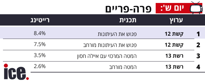 פגוש את העיתונות מובילה בפרה פריים ומביאה לקשת 12 הובלה גם ברצועה הזאת עם 8.4%. הסגנית שלה לרצועה היא פגוש את העיתונות מורחב עם 7.5% ברייטינג. לעומת זאת ברשת 13 המטה המרכזי זוכה ל-3.5%, ואילו המטה מורחב זוכה ל-2.6% ברייטינג.