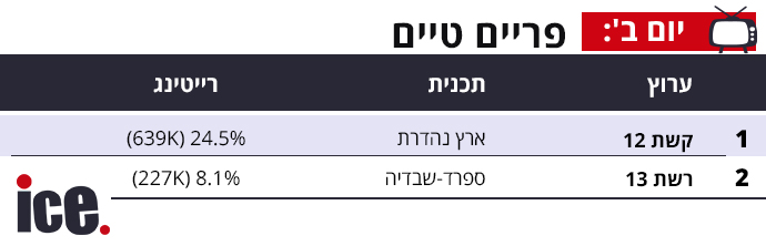 בתכנית הפריים טיים, קשת 12 ניצחה את הרייטינג עם סיום העונה של ארץ נהדרת, פרק הסיום יממה לאחר הקמת הממשלה ה-36, זכה לרייטינג של של 24.5% וכ-639 אלף צופים לעומת המשחק הראשון של ספרד ביורו הנוכחי נגד שבדיה שנגמר בתוצאה 0:0 וזכה לרייטינג של 8.1% וכ-227 אלף צופים.