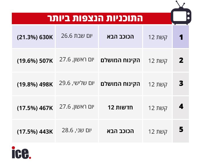 גם השבוע אף תכנית של רשת לא נכנסה לטופ 5, שם שולטת בגאון הכוכב הבא, יחד עם הקינוח המושלם ואפילו מהדורה נוספת של חדשות 12, מי כבשה את הפסגה עם הרייטינג הגבוה ביותר?