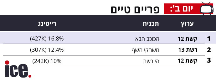הרייטינג אתמול מסתכם בניצחון של קשת 12 בכל הרצועות, אחרי שדאגו הערוץ לפצל את רצועת הפריים טיים והוסיפו פרק קצר של הכוכב הבא לפני פרק בסדרה "היורשת". זה אכן עזר לרצועה ב-12 אבל לא לחלוטין, כי משחקי השף של 13 לא נותרה מאחור.