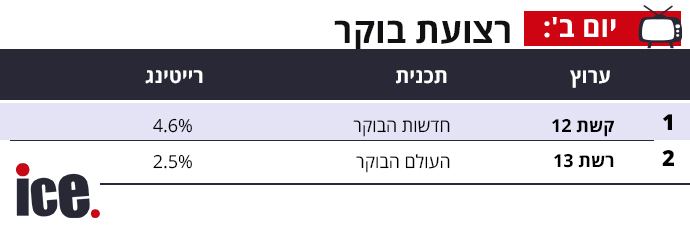 חדשות הבוקר עם ניב רסקין יורדת מאתמול אך עדיין מנצחת את הרצועה עם 4.6% ברייטינג. רשת עם העולם הבוקר בהגשת אברי גלעד ורותם ישראל משיגים 2.5% על התוכנית אתמול.
