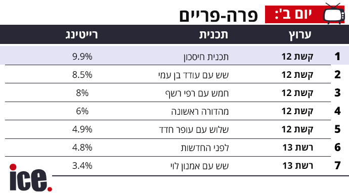 תוכנית חיסכון עדיין משאירה את קשת 12 בראש הפריים טיים אך עם ירידה קלה מאתמול ונתונים של 9.9%. שש עם עודד בן עמי במקום השני לטבלה עם 8.5%, וחמש עם רפי רשף במקום השלישי עם 8%. מהדורה ראשונה מקבלת 6%, ועופר חדד עולה מעט בטבלה עם 4.9%. לפני החדשות ברשת 13 מגיעה למקום השישי בטבלה עם 4.8%.
