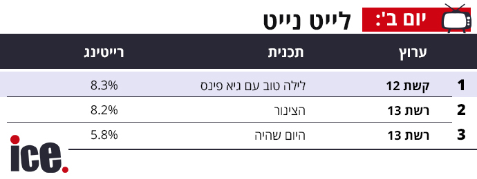 בלייט נייט קרב צמוד בין לילה טוב עם גיא פינס בקשת 12 לתוכנית הצינור ברשת 13 כשגיא פינס מנצחת על עשירית האחוז עם 8.3% מול 8.2% שמשיגה הצינור. היום שהיה ברשת 13 משיגה 5.8% לתוכנית של אתמול.