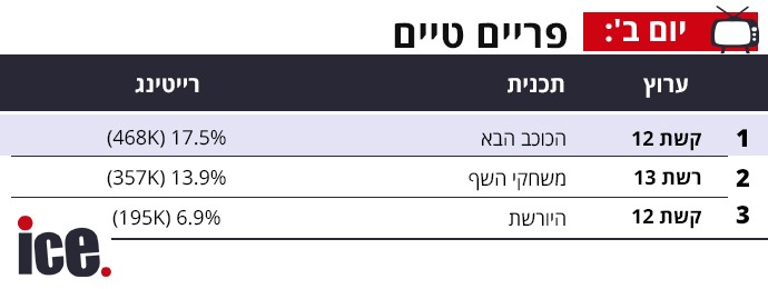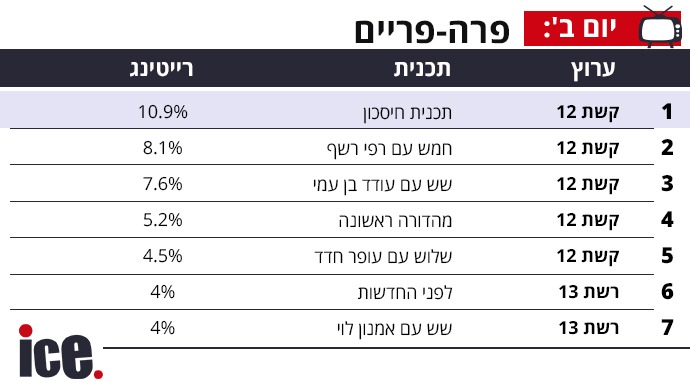בפרה פריים, תכנית חיסכון רשמה 10.9% עבור קשת 12 כאשר חמש עם רפי רשף השיגה 8.1%, שש עם עודד בן עמי עם 7.6%, מהדורה ראשונה רשמה 5.2%, שלוש עם עופר חדד בסך הכל עם 4.5%, ועדיין רשת 13 נותרה מאחור כשלפני החדשות ושש עם אמנון לוי קיבלו 4% כל אחת.