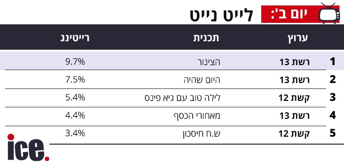 למרות אלו, רשת 13 לפחות הובילה את הלייט נייט עם הצינור שרשמה 9.7% רייטינג ו-247 אלף צופים, לעומת קשת עם היורשת עם 6.9% ו-195 אלף צופים. רשת הובילה גם עם היום שהיה שהשיגה 7.5% ו-190 אלף צופים, לעומת קשת עם גיא פינס שהשיג 5.4%. מאחורי הכסף ברשת 13 עם 4.4% בעוד ששידור חוזר של תכנית חיסכון בקשת 12 עם 3.4% בלבד.