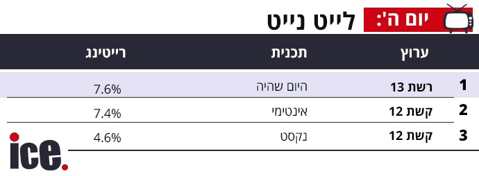 אבל לפחות רשת 13 רשמה את הניצחון שלה ברצועת הלייט נייט בזכות היום שהיה עם 7.6% רייטינג לעומת קשת 12 שנשארה מאחור עם אינטימי שהביאה 7.4% ונסקט שהסתפקה ב-4.6% בלבד.