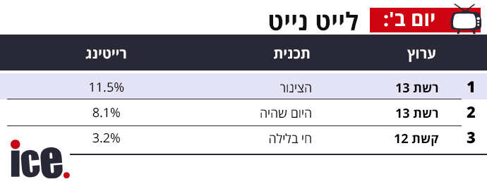 הצינור מנצחת אתמול את רצועת הלייט נייט ומשאירה גם את רצועת הלילה אצל רשת 13 עם 11.5% לתוכנית של גיא לרר. גם היום שהיה ברשת 13 עוקפת את קשת 12 ומתמקמת במקום השני ברצועה בזכות נתון של 8.1%. חי בלילה בקשת 12 מגיעה רק ל-3.2% וסוגרת את הרשימה.