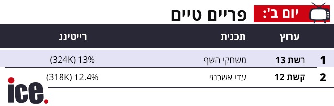 הקרב על הפריים טיים אמש (שני) היה לוהט במיוחד, כאשר משחקי השף ניצחה את הקרב על הפריים טיים עם 13% רייטינג ו-324 אלף צופים, לעומת קשת 12 עם שיטת אשכנזי שהמשיכה בדשדוש וירדה ל-12.4% רייטינג ו-318 אלף צופים.