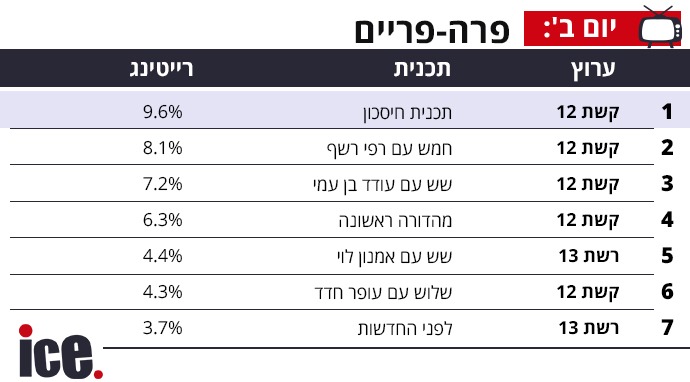 בקרב על הפרה פריים, קשת 12 ניצחה די בקלות כאשר תכנית חיסכון גרפה 9.6%, חמש עם רפי רשף נהנתה מ-8.1%, שש עם עודד בן עמי הביאה 7.2%, מהדורה ראשונה עם 6.3%, כאשר שש עם אמנון לוי ברשת 13 הגיעה למקום החמישי ברצועה עם 4.4% ולפני החדשות עם 3.7%, כשבתווך שלוש עם עופר חדד בקשת 12 עם 4.3%.