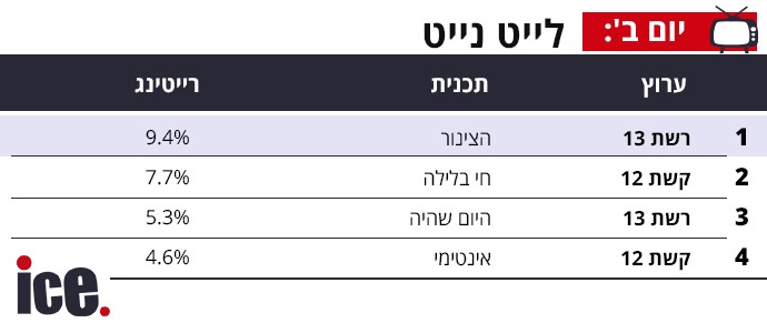 רשת 13 הובילה גם את הלייט נייט עם הצינור, שגרפה 9.4% לעומת קשת עם חי בלילה שהביאה רק 7.7% רשת הובילה גם עם היום שהיה עם 5.3% לעומת קשת 12 עם אינטימי בשידור חוזר שגרפה 4.7% בסך הכל.