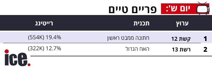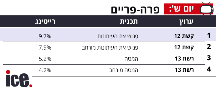 קשת 12 מוביל את הפרה טיים עם פגוש את העיתונות מוביל את הרצועה עם 9.7% כשאחריו פגוש את העיתונות מורחב עם 7.9%. רשת 13 מגיע למקום השלישי בטבלה עם המטה המרכזי שזוכה אתמול ל-5.2% והמטה מורחב סוגרת את הטבלה עם 4.2% לערוץ.