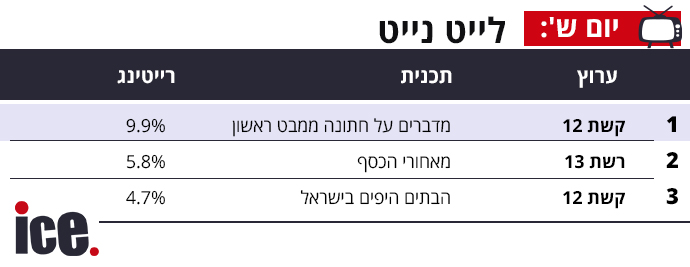 ברצועת הלייט נייט קשת 12 נשאר המוביל ברייטינג עם 9.9% לתוכנית "מדברים על חתונה ממבט ראשון". רשת מגיע למקום השני בטבלת הלייט נייט עם הבתים היפים בישראל שמביאה 4.7%, ומאחורי הכסף ברשת 13 סוגרת את הרשימה עם 5.8%.