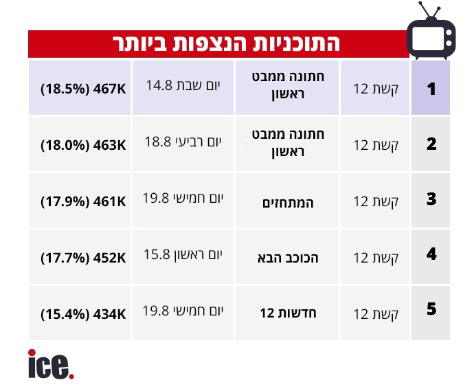האח הגדול, משחקי השף ושאר התכנים של רשת לא הצליחו להוות אתגר לכוכב הבא, חתונה ממבט ראשון ואפילו למהדורת חדשות 12. מי השיגה את המקום הראשון ואיזה תכניות נוספות נכנסו לטופ 5?