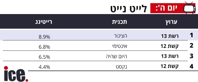 שוב נשבר השיא השלילי על ידי הריאליטי של רשת 13 שרשם את הנתון הכי נמוך שלו 10.7% בלבד, גם בקשת 12 לא רשמו נתון מדהים, האם זה הספיק? במהדורות החדשות מדובר בניצחון במעמד צד אחד, ומה עם הלייט נייט?