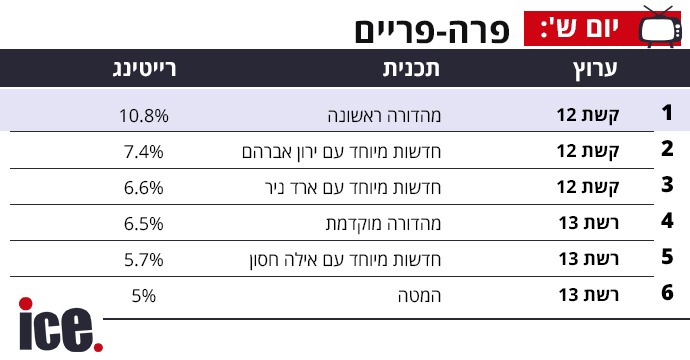 בפרה פריים, קשת 12 עם שורה של ניצחונות, כאשר מהדורה ראשונה הובילה עם 10.8%, חדשות מיוחד עם ירון אברהם הוסיפה 7.4%, חדשות מיוחד עם ארד ניר זכתה ל-6.6%, בעוד שברשת 13 מהדורה מוקדמת הסתפקה ב-6.5%, חדשות מיוחד עם איילה חסון ב-5.7% והמטה עם 5% בסך הכל.