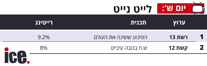 בקרב בלייט נייט, רשת 13 ניצחה עם סרטו התיעודי של גיל תמרי 'הפיגוע ששינה את העולם' לרגל 20 שנה לאסון 9/11 עם 9.2% את בגובה העיניים בשידור חוזר של קשת 12 שהסתפקה ב-8%.