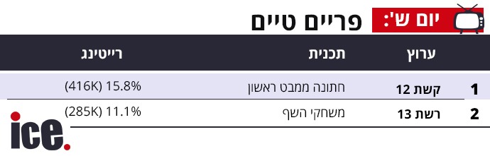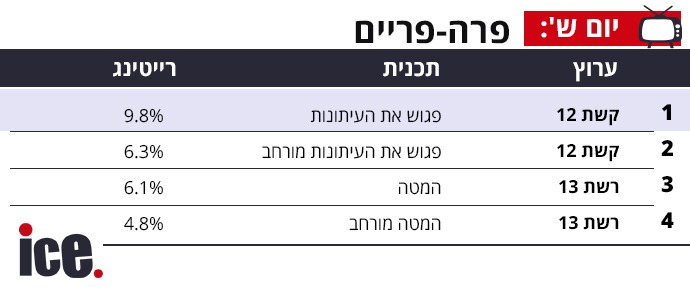 בפרה פריים קשת 12 ניצחה בלי בעיות, כאשר פגוש את העיתונות זכתה ל-9.8% ופגוש את העיתונות המורחב השיגה 6.3%, בעוד שהמטה ברשת 13 קיבלה 6.1% והמורחב ל-4.8% בלבד.