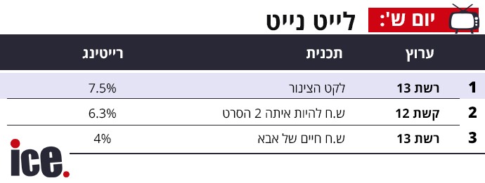 רשת 13 מתקרבת לגמר ריאליטי הבישול והשיגה 11.1% לקרבות בין השפים למתמודדים על הכרטיס לגמר, האם זה הספיק מול חתונה ממבט ראשון? בקרב בין המהדורות המרכזיות הפער גדול, ומי ניצחה בלייט נייט?