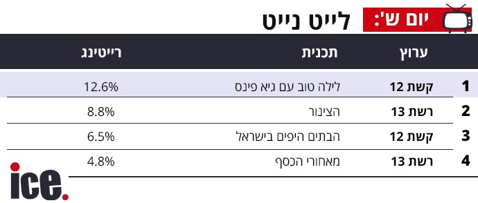 בתוכניות הלייט נייט, לילה טוב עם גיא פינס היא המנצחת הגדולה עם 12.6% רייטינג לעומת הצינור ברשת 13 עם 8.8% רייטינג. לאחר מכן, הבתים היפים בישראל בקשת 12 עם 6.5% לעומת מאחורי הכסף של רשת 13 עם 4.8%.