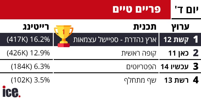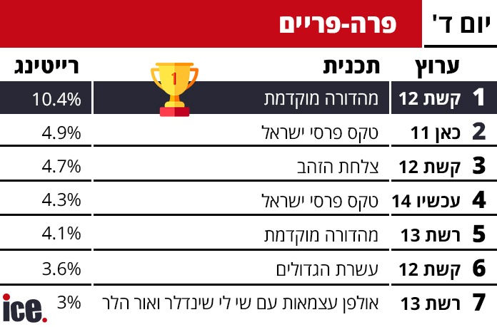 בפרה פריים, מהדורה מוקדמת עם 10.4% בקשת 12, טקס פרסי ישראל בכאן 11 רשם 4.9%, מעל צלחת הזהב בקשת 12 שהסתפקה ב-4.7%, טקס פרסי ישראל בערוץ 14 עם 4.3% בסך הכל, מהדורה מוקדמת ברשת 13 עם 4.1%, עשרת הגדולים בקשת 12 עם 3.6%.