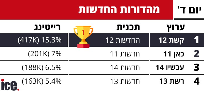 בקרב בין מהדורות החדשות, חדשות 12 ניצחה בגדול עם 15.3% ו-417 אלף צופים, אבל כאן 11 הפתיעה את שאר המתחרות והשתחלה למקום השני עם 7% למאיה ראכלין ו-201 אלף צופים, חדשות 14 אחריה עם 6.5% ו-188 אלף צופים, חדשות 13 אחרונה עם 163 אלף צופים ו-5.4% בלבד.