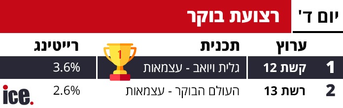 בקרב בין תכניות הבוקר, גלית גוטמן ויואב לימור השיגו בתכנית המיוחדת לכבוד העצמאות, נתון של 3.6%, שעקף את גאולה אבן ברשת 13 שרשמה רק 2.6% ל'העולם הבוקר' בהגשתה.
