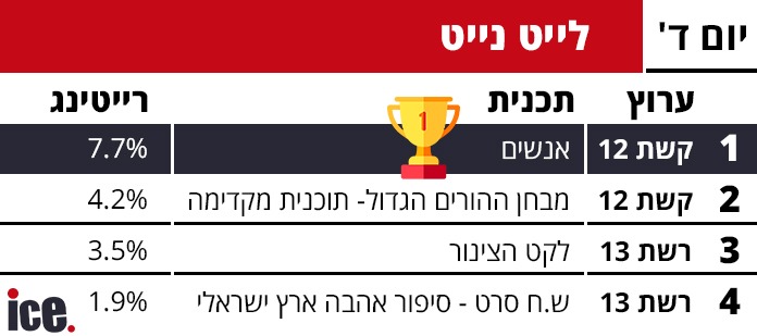 בקרב הלייט נייט, קשת 12 גם כן ניצחה בגדול כאשר 'אנשים' עם נסלי ברדה השיגה 7.7%, מבחן ההורים הגדול השיגה לתכנית המקדימה 4.2%, שעקפה את לקט 'הצינור' ברשת 13 עם 3.5% וסיפור אהבה ארץ ישראלי שהשיג 1.9%.