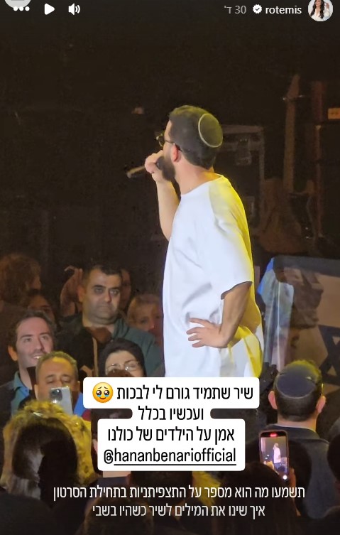 בהמשך, דאגה רותם ישראל לשתף את עוקביה ברגע מרגש מתוך הופעתו של חנן בן ארי. הזמר המפורסם ביצע את השיר "אמן על הילדים שלי", וסיפר כי התצפיתניות שינו את המילים של הלהיט כשהן היו בשבי חמאס.