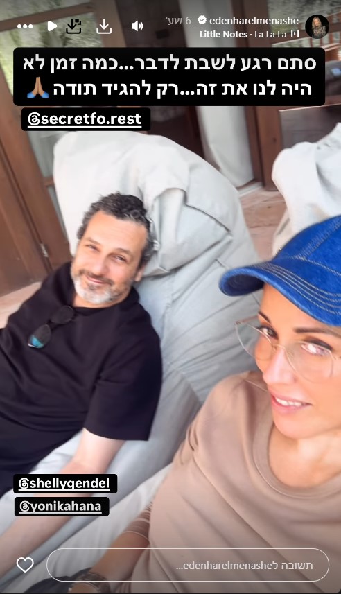עדן הראל, שהשתעשעה מדבריו של בעלה, סיפרה לעוקביה: "יצאנו לטייל קצת ביער. לא מספיק שהוא לא בא איתי לאף שיעור יוגה, הוא עוד מקטר שלקחתי אותו להתבודדות בטבע". "אפשר להתבודד בלובי", השיב מנשה.
