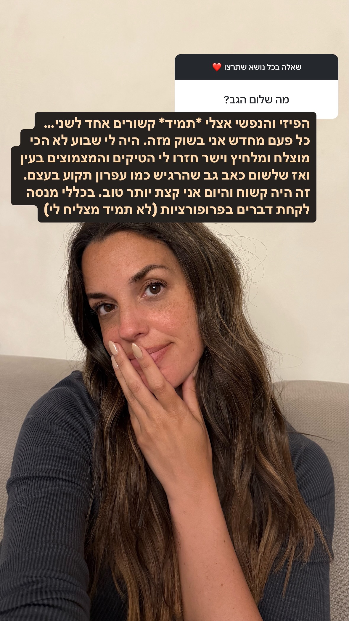 בהמשך, שיתפה הראל: "היה לי שבוע לא הכי מוצלח ומלחיץ וישר חזרו לי הטיקים והמצמוצים בעין ואז שלשום כאב גב שהרגיש כמו עפרון תקוע בעצם. זה היה קשוח והיום אני קצת יותר טוב. בכלל, מנסה לקחת דברים בפרופורציות (לא תמיד מצליח לי)".