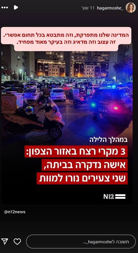 הגר משה, כוכבת העונה השלישית של תוכנית הטלוויזיה "חתונה ממבט ראשון", שיתפה את עוקביה באינסטגרם בתחושותיה נוכח מקרי הרצח שהתרחשו לאחרונה באזור הצפון. כידוע, במהלך הלילה אירעו שלושה מקרי רצח ובכך רשימת קורבנות האלימות בישראל מאז תחילת השנה, מתארכת.