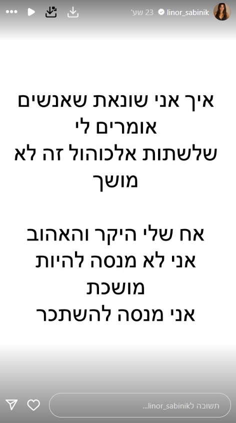 אמש (רביעי) פרסמה לינור סביניק סטורי בחשבון האינסטגרם שלה ובו היא סיפרה על הערה עוקצנית שקיבלה אשר עוררה את זעמה הרב: "איך אני שונאת שאנשים אומרים לי שלשתות אלכוהול זה לא מושך. אח שלי היקר והאהוב אני לא מנסה להיות מושכת, אני מנסה להשתכר".