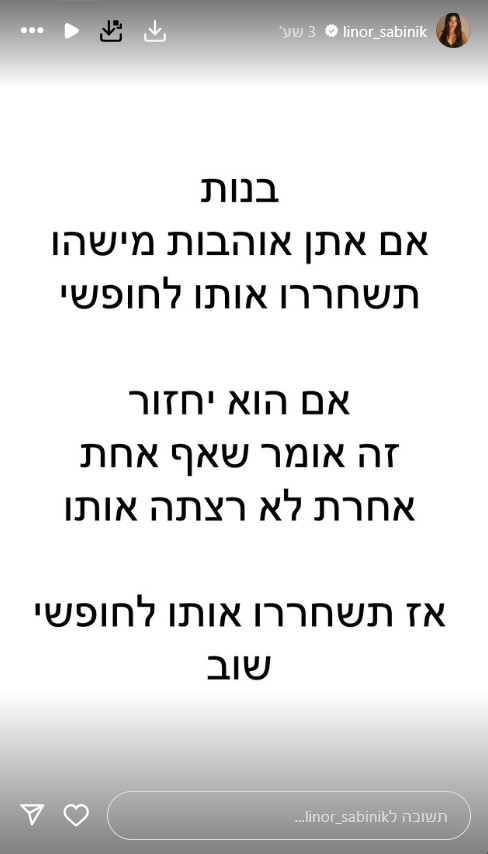 "בנות, אם אתן אוהבות מישהו, תשחררו אותי לחופשי. אם הוא יחזור, זה אומר שאף אחת אחרת אותו אז תשחררו אותו לחופשי שוב", כתבה סביניק. כזכור, כוכבת "האח הגדול" הודיעה בחודש מרץ האחרון כי היא ובעלה איש הנדל"ן רן גבאי, התגרשו לאחר שנישאו ביוני 2023.