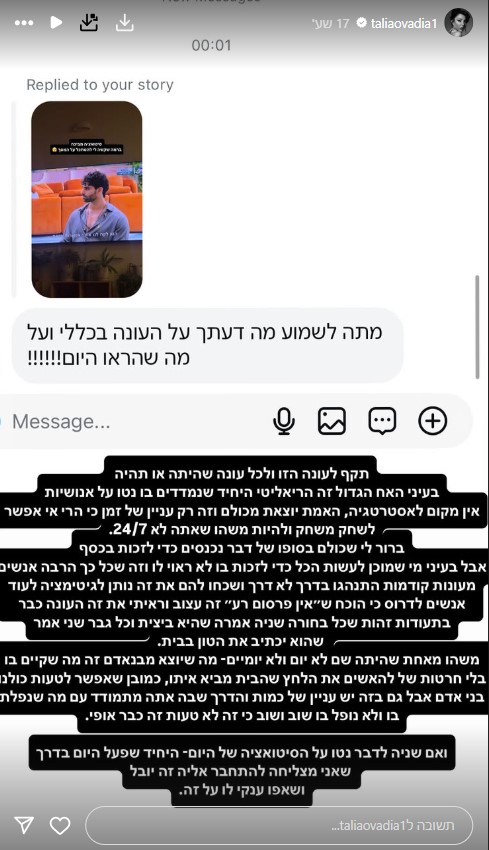 הדייר שדווקא הרשים את טליה עובדיה הוא לא אחר מאשר יובל לוי. "היחיד שפעל בדרך שאני מצליחה להתחבר אליה זה יובל ושאפו ענקי לו על זה", כתבה הכוכבת הישראלית לעוקביה באינסטגרם.