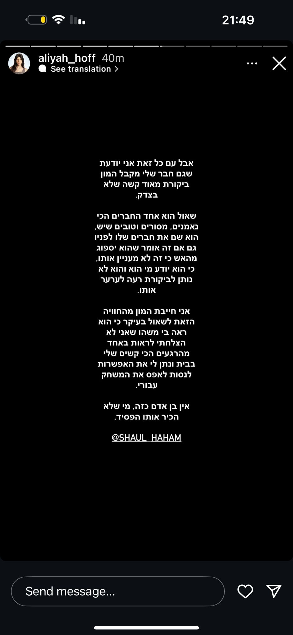 "אני שמחה לראות שלמרות הכל הצלחתי להגיע אליכם אני שמחה שהכרתי את הדיירים האלה שהפכו למשפחה שנייה, שהכרתי אנשים מדהימים, חברים. מבטיחה להגיע לכל ההודעות שלכם, פשוט ייקח לי רגע".