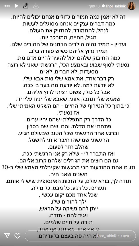 בסטורי שהיא העלתה לחשבון האינסטגרם שלה, כוכבת הריאליטי סיפרה על תפקידם החיוני של ההורים בחיי ילדיהם בעתות משבר. "זה לא יאמן כמה חמורים גדולים אנחנו יכולים להיות. כמה דברים ענקיים אנחנו מסוגלים לעשות. לנהל, להתמודד, להחזיק את העולם. הגיל, החיים המורכבויות. ועדיין - תמיד נהיה הילדים בקטנים של ההורים שלנו. תמיד נרוץ אליהם כשיש סערה בלב. כמה החיבוק שלכם יכול להעיר לחיים אדם מת", כתבה סביניק.