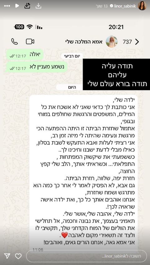 כוכבת הריאליטי הציגה לראווה צילום מסך מתוך ההתכתבות באפליקציית הוואטסאפ, שהתנהלה בינה לבין אמה האהובה. בהודעה שקיבלה, אמה של לינור סביניק כתבה כך: "מבלי לדעת, ישבנו וחיכינו לך. כששמעתי את שקשוק המפתחות, התפלאתי. כשראיתי אותך, הלב שלי קפץ החוצה".