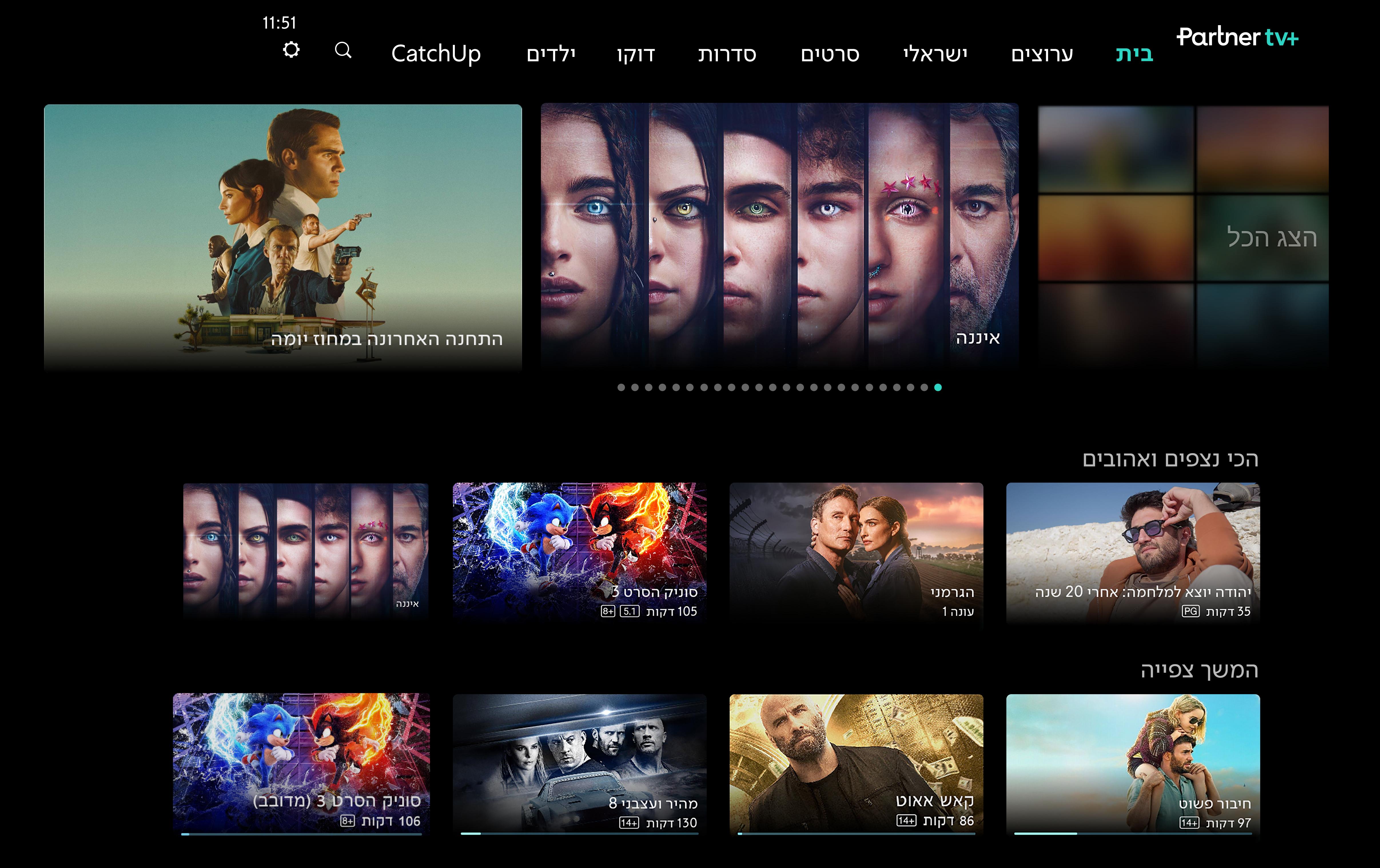 מה עוד? יש בשירות ממשק מתקדם ואינטואיטיבי שכולל Catch-Up, הקלטות, Start Over, בניית רשימת צפייה אישית ודף בית עם המלצות אישיות וקטגוריות כמו 'התכנים הנצפים והאהובים', 'המשך צפייה' ועוד. ניתן לצפות באמצעות ממירי פרטנר, סטרימרים, טלוויזיות חכמות, סמארטפונים וטאבלטים.