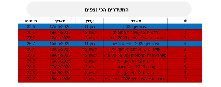 הרייטינג הכי טוב בישראל ב-2025 נחשף וגם התכנית שהפנטה אתכם במסך. מי עקפה 32% ומי הייתה הכי יציבה לאורך עונה שלמה? סיכום השנה העברית ברייטינג מראה כי כאן 11 חיה ובועטת. הנתונים החל מערב ראש השנה 2.10.2024 ועד 3.9.2025 יש כמה הפתעות לא קטנות ויובל רפאל אחת.