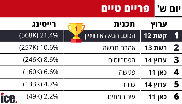 במסגרת הפריים טיים במקום הראשון נמצאת התכנית הכוכב הבא לאירוויזיון שמרסקת את המתחרים עם רייטינג של 21.4% ו-568 אלף צופים. במקום השני רשת 13 עם תכנית השידוכים "אהבה חדשה" עם 10.6% רייטינג ו-257 אלף צופים. במקום השלישי הפטריוטים של ערוץ 14 עם 8.6% רייטינג ו-246 אלף צופים. במקום הרביעי כאן 11 עם פגישה שרשמה 6.6% רייטינג ו-160 אלף צופים. במקום החמישי שיחה של ערוץ 14 עם 4.7% ו-133 אלף צופים. במקום השישי כאן 11 עם עיר המתים 2.2% רייטינג ו-49 אלף צופים.