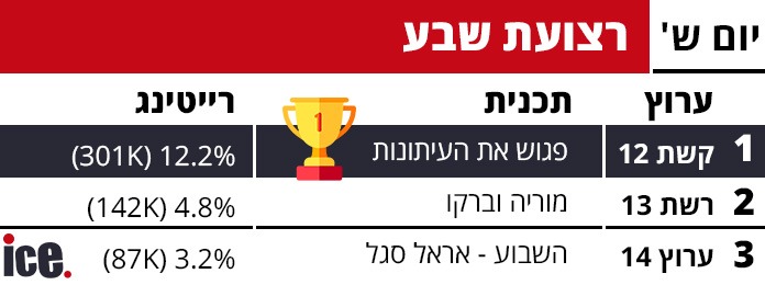 2.ומה לגבי נתוני הרייטינג של יום שישי? (ל"ת)אזרח הגון 01/2026/18הגב לתגובה זו1 0סגור