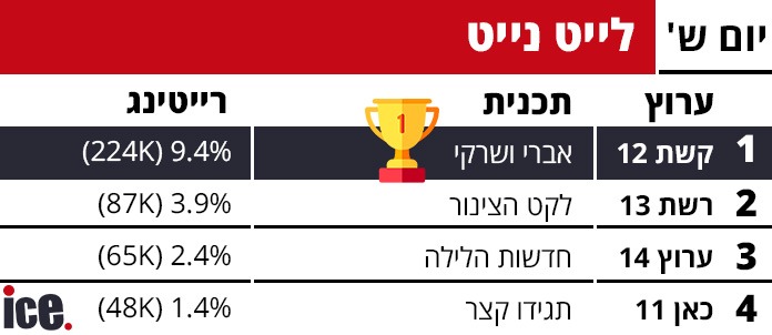 במסגרת תכניות הלייט נייט: במקום הראשון, קשת 12 עם אברי ושרקי שרושמת 9.4% רייטינג ו- 224 אלף צופים. במקום השני רשת 13 עם לקט הצינור שרשמה 3.9% רייטינג ו-87 אלף צופים. במקום השלישי חדשות הלילה עם 2.4% ו- 65 אלף צופים. במקום הרביעי תגידו קצר של כאן 11 עם 1.4% ו-48 אלף צופים.