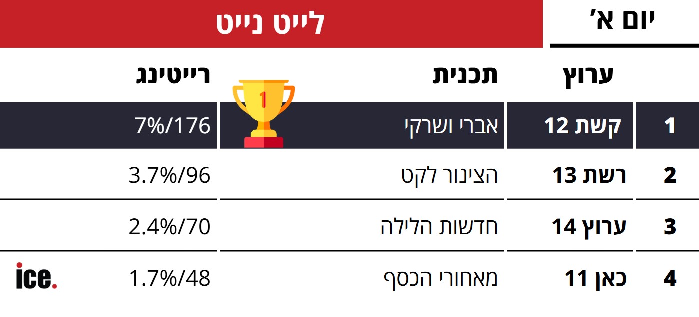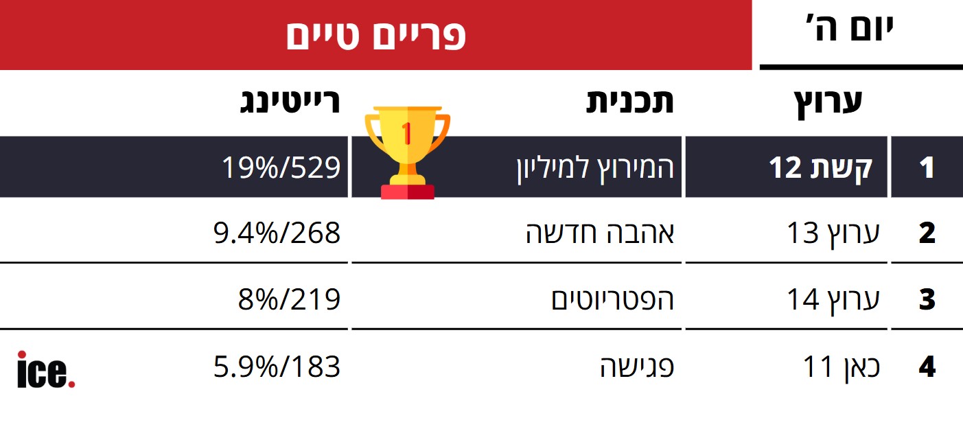 רייטינג: המירוץ למיליון של קשת 12 כובשת את המקום הראשון עם 19% רייטינג שהם כ-529 אלף צופים. מי כבש את הלייט נייט? | כל הפרטים